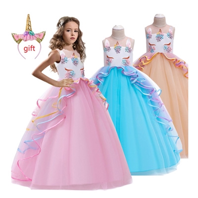 Girl Birthday Dress Unicorn Long Dress Colorful Mesh Cake Fluffy