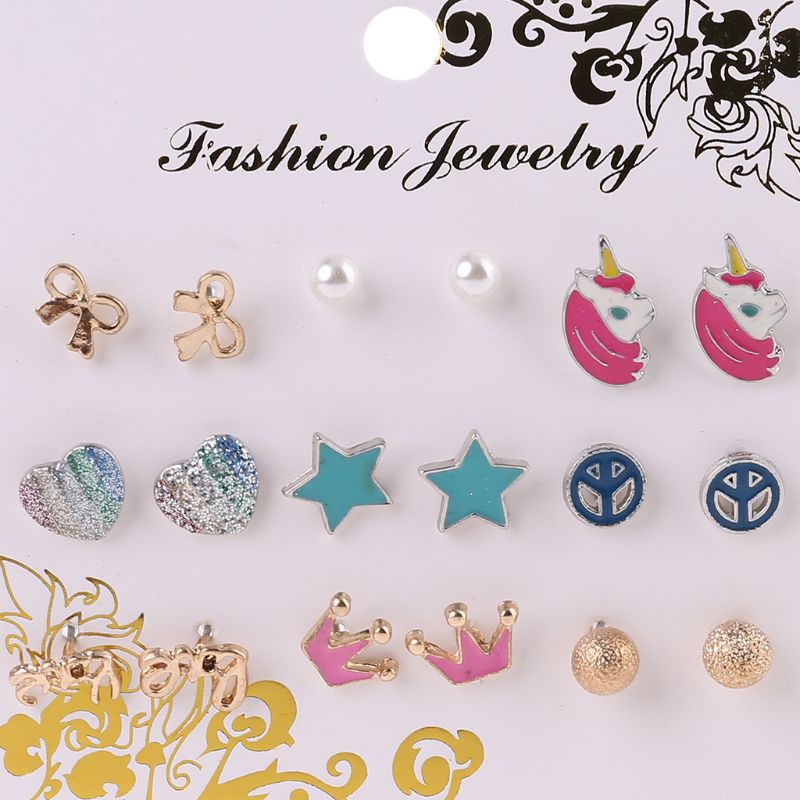 9 Pairs Cute Small Unicorn Butterfly Bowtie Stud Earring Set For