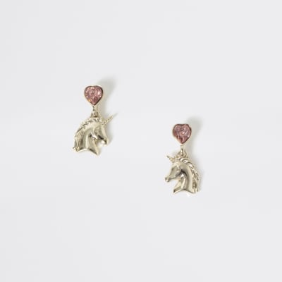 Girls Gold Colour Unicorn Diamante Earrings River Island