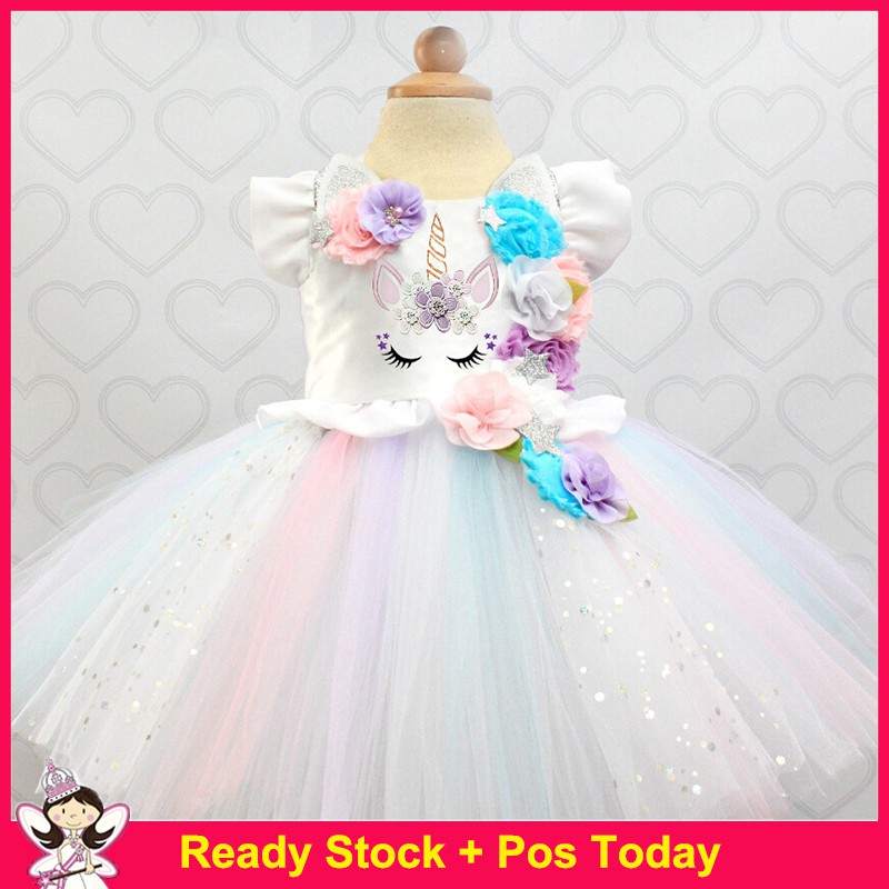 Princess Unicorn Birthday Outfits Flower Girls Rainbow Dress With